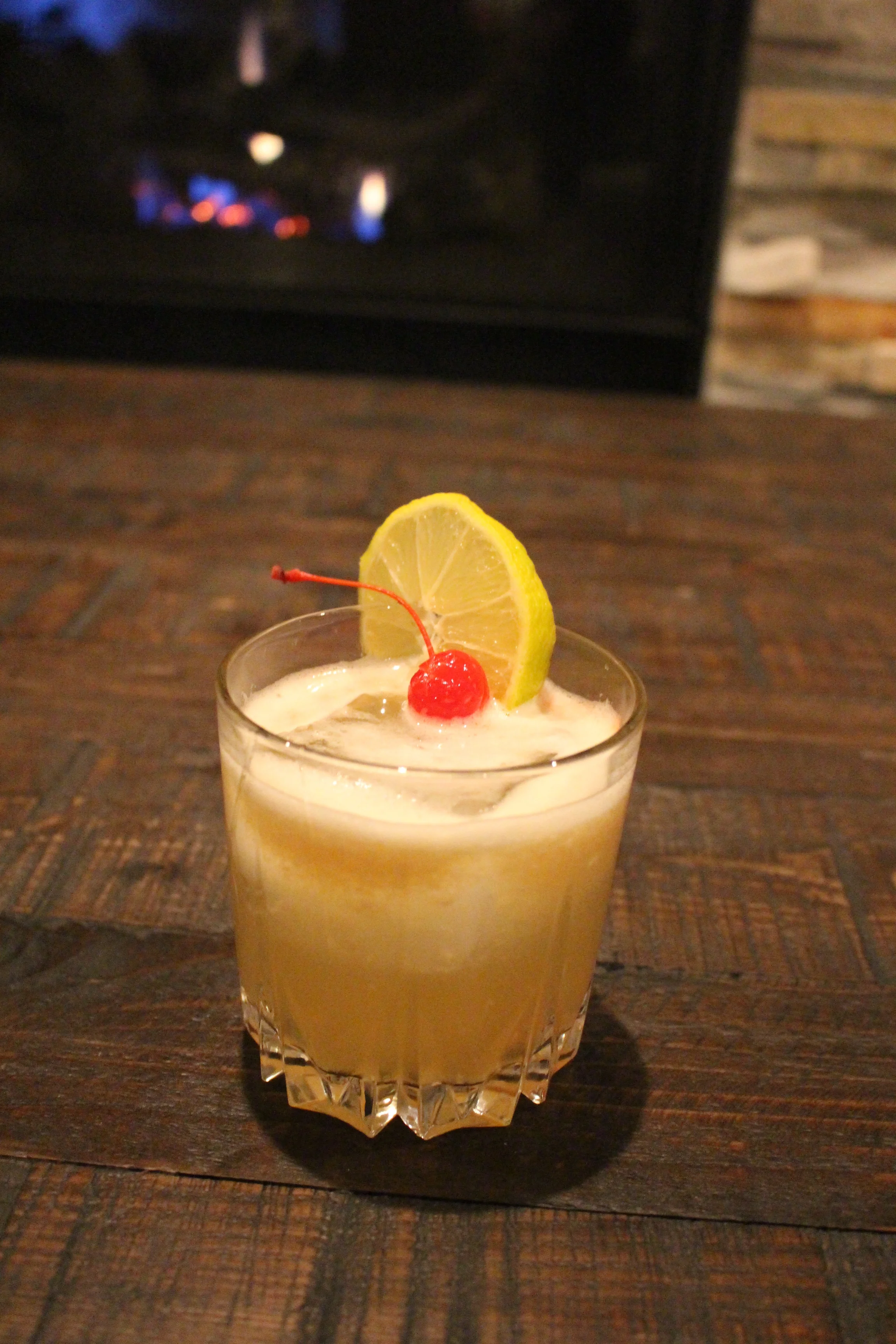In a lowball glass, set a single extra-large ice cube inside. (You can find these ice trays at stores like Wal-Mart, Target, etc.) Set aside. In a cocktail shaker, fill with ice. Add the whiskey, sugar, lemon juice and egg white. Cover and shake vigorously for at least 30 seconds to make sure you have evenly distributed the egg white. Strain into the lowball glass with the ice cube. Garnish with the lemon slice and cherry. Cheers!!